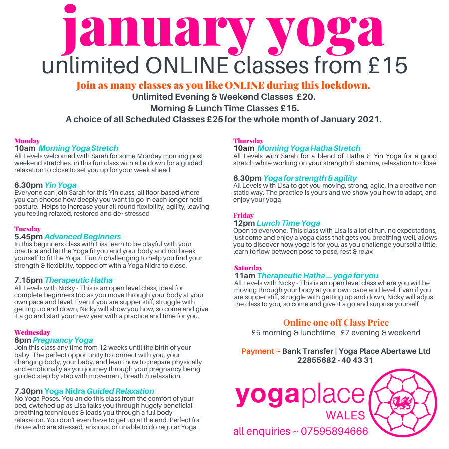 JANUARY 2021 unlimited yoga classes at Yoga Place Abertawe