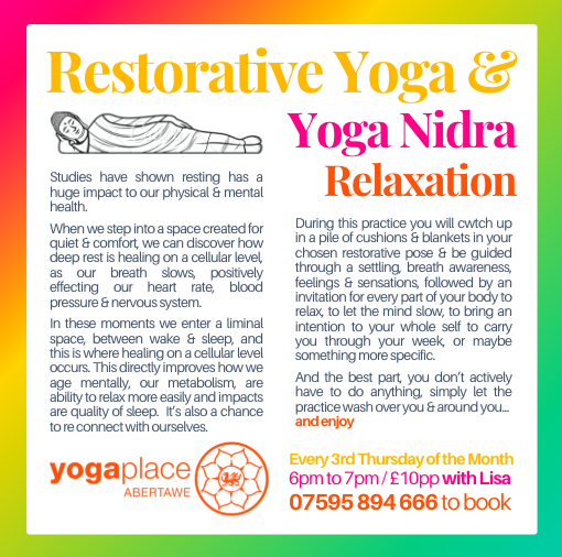 You will be invited to lie in a super supportive Restorative Yoga Pose, using all our props, from lots of cushions, bolsters & blankets. Once totally comfy, the practice of Yoga Nidra will begin, using pranayama, breath work to guide you through this blissful practice… no standing, no kneeling, just simply lying and letting yourself bath in a moment of rest.